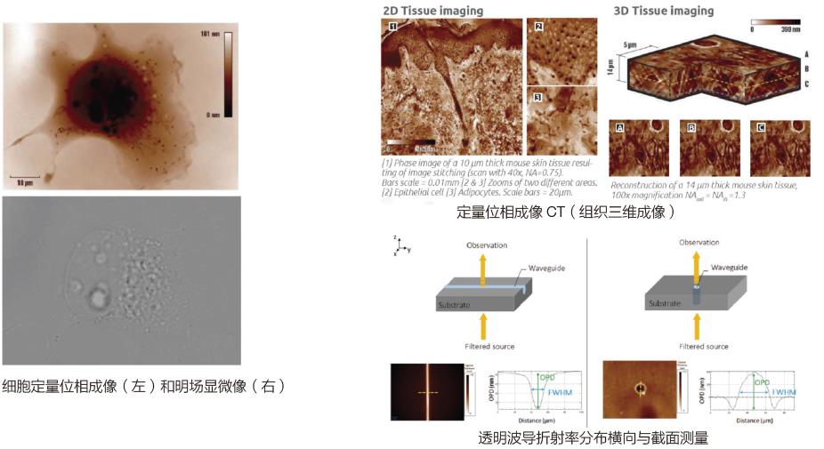 相襯成像是生物領域廣泛使用的技術,可以對吸收均一但折射率有起伏的樣品進行無標記成像。有別于傳統的相襯成像(在顯微成像系統中插入位相板)只能展現位相越變邊界處的結構,定量位相成像可以高分辨率完整地檢測樣品位相的細微變化,充分利用生物細胞、組織等的相位襯度;同時,還能通過位相變化測量其他樣品的表面深度、折射率變化等。定量位相成像是一種有非常大潛力的成像技術。