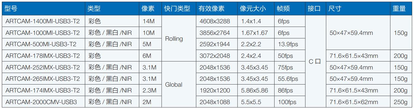 日本ArtRay的USB3.0 CMOS相機(jī)參數(shù):