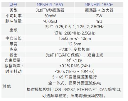 綜上,我們列舉了一些基于高重復頻率飛秒激光器架構寬梳齒結構光頻梳的優點,那么瑞士Menhir公司的1550nm,GHz級別重復頻率的光纖飛秒激光器有什么優勢呢?