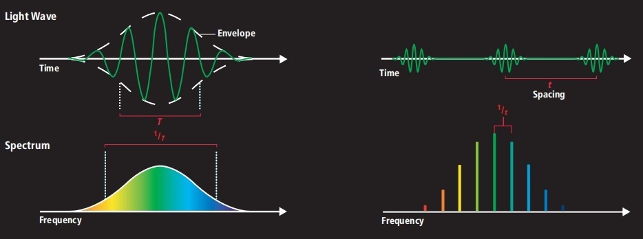對于第一個問題,“為什么要采用高重復頻率的飛秒激光器搭建光頻梳”?大致來源于一個由來已久的誤會。很簡單,如果用鎖模飛秒激光器架構光頻梳,光頻梳的梳齒間距就是飛秒激光器自身的重復頻率。也就是說250MHz重復頻率的飛秒激光器可以用來搭建250MHz梳齒間距的光頻梳,而1GHz重復頻率的飛秒激光器可以用來搭建1GHz梳齒間距的光頻梳。小編說過,對于Menhir廠家的產品而言,重頻越高則激光器價格越高。那么,光頻梳難道不是梳齒越精細越好么?我還有什么理由買更貴的激光搭建梳齒間隔更寬的光頻梳呢?