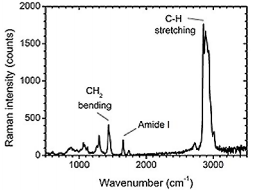 TRPS的顯微擴(kuò)展使激光可以聚焦到小孔上,并用光鑷的方法俘獲單個(gè)囊泡,從而獲取單個(gè)囊泡的拉曼光譜。圖4為單血小板源性囊泡的拉曼光譜圖。拉曼峰表征了出現(xiàn)在這種囊泡內(nèi)的特征化學(xué)成分。