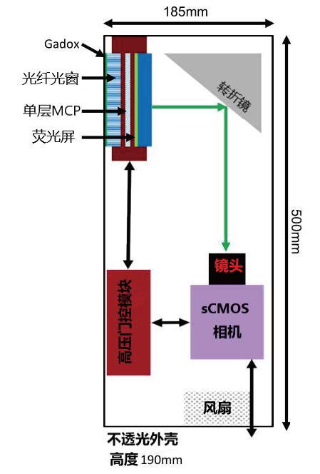 N-Cam 使用20μm 厚的Gadox 閃爍體直接應用于75mm Photek 像增強器前端(如右下圖所示)。像增強器中單層微通道板后端使用具有快速衰減時間的P46 熒光屏,使閃爍體的光信號可放大104 倍,而后聚焦成像在具有2048 x 2048 像素,等效像素38μm 的制冷型sCMOS 相機上。與傳統中子相機比較,N-Cam 可以在不犧牲空間分辨率的情況下通過像增強器顯著提高靈敏度。通過理論估算和實驗分析,N-Cam 在中子通量為2×107n/ cm2/s 情況下依然可以達到很好的信噪比。同時由于N-Cam 的高靈敏度因此在低通量中子實驗中仍然可以進行成像分析。