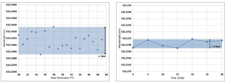 左圖, Torus 532 的波長穩定度隨環境溫度的變化圖 右圖, Torus 532 的波長穩定度隨工作時間的變化圖
