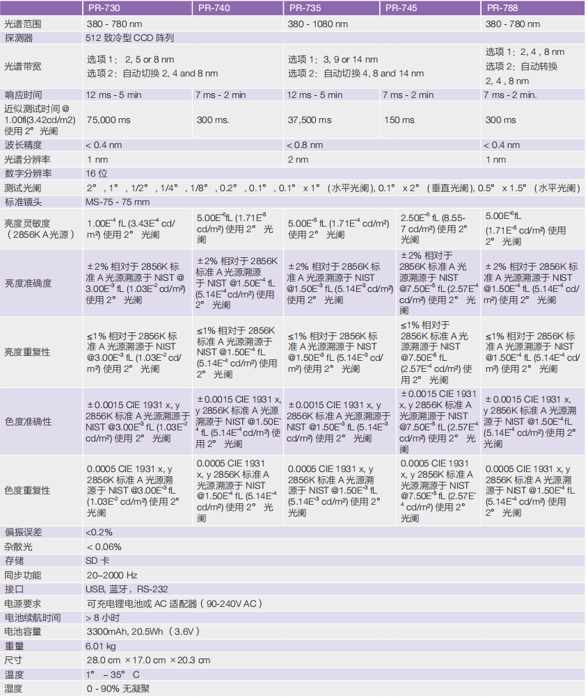 Photo Research 公司擁有幾十年的光度計生產制造經驗,并推出超靈敏光譜測試系統 - 制冷型號探測器PR-730/735 和 PR-740/745 , PR-788 光譜式光度色度輻射度計。PR-730 和 PR-740, PR-788 覆蓋可見光譜,從 380nm 到 780nm, 而 PR-735 和 PR-745 覆蓋 380nm 到1080nm 可見光到近紅外光譜波段,是針對近紅外輻射度測試的最佳方案。PR-788 具有業界領先的 1000000:1 的動態范圍,它提供了在不必增加外部衰減或改變幾何光學(例如測量場地尺寸)的情況下,即可從黑到全白測試設備輸出的解決案。