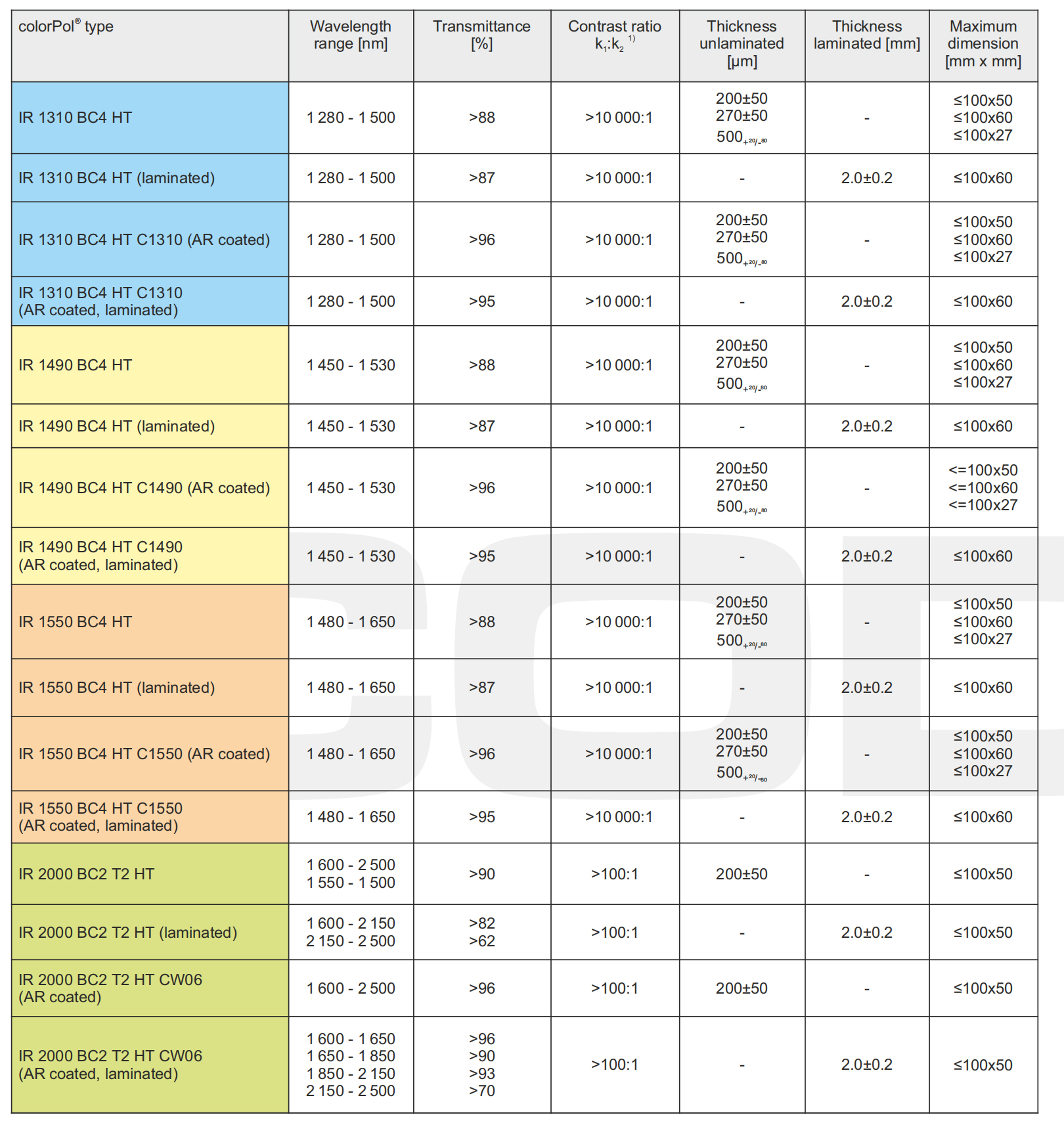 Contrast ratios >100,000:1, other thicknesses, shapes or dimensions available on special request. Reflflection losses can be minimized by anti-reflflection-coatings. CODIXX AG reserves the right to change technical information without notice.