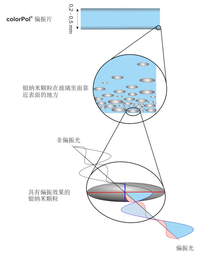通過CODIXX的特殊制造技術(shù),可以精準確定銀納米顆粒的大小、密度和方向。橢圓形的幾何形狀產(chǎn)生偏振特性所需的一個長軸和一個短軸。它們根據(jù)波長吸收光的所有橫波,僅允許沿對稱軸方向的光波通過。所有納米顆粒的分布必須絕對平行,以產(chǎn)生完美的線偏振光。